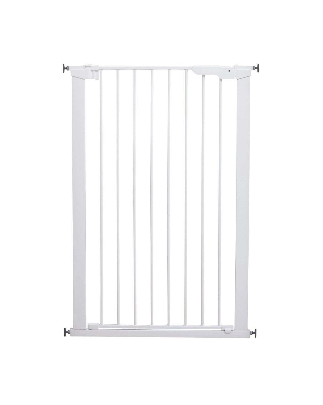 Denna grind öppnas åt båda hållen och du kan enkelt öppna den med bara en hand. Den röda säkerhetsindikatorn under handtaget visar exakt när husdjursgrinden är korrekt installerad för maximal säkerhet. Bonnie är 104,5cm hög och passar i öppningar från 73,5cm till 79,6cm.