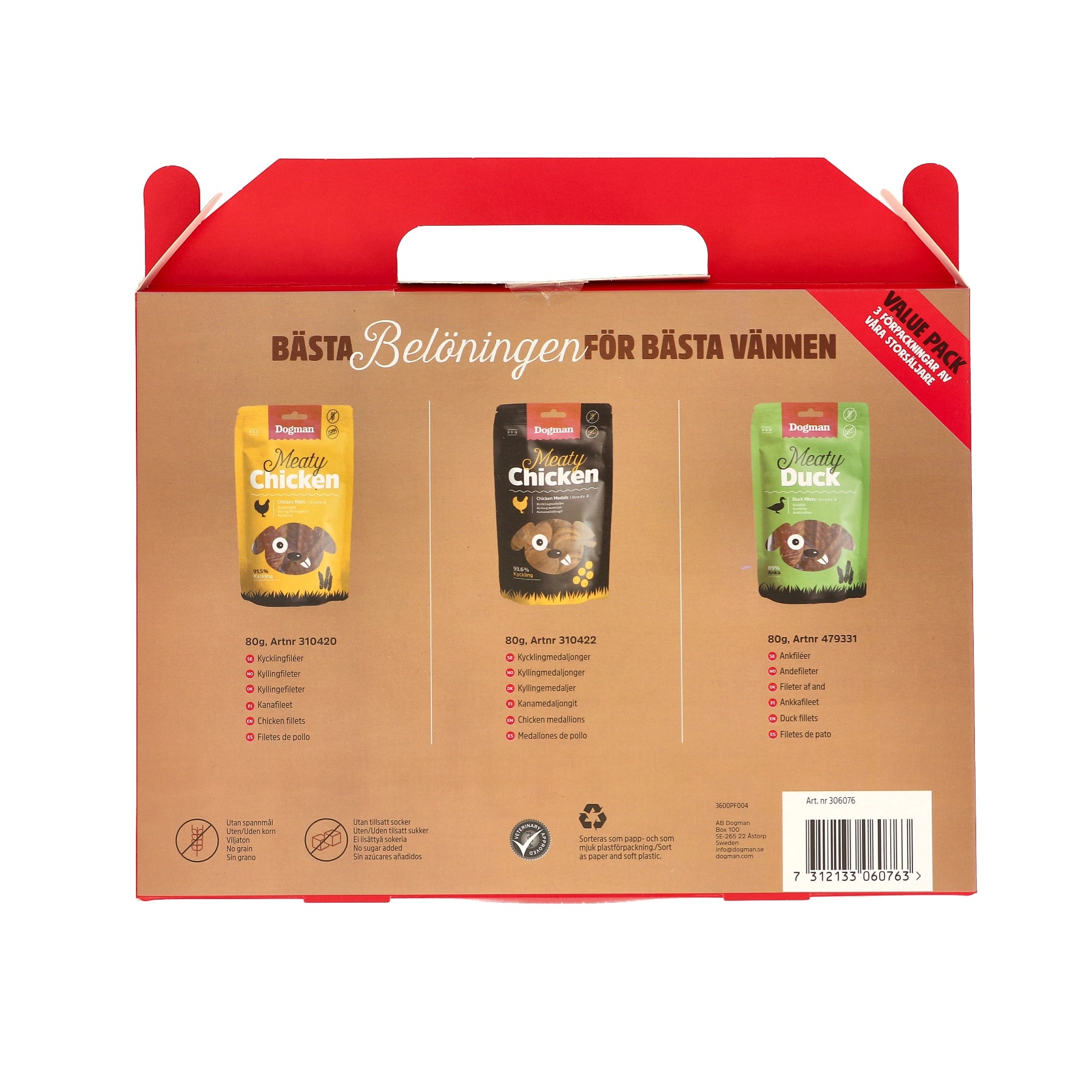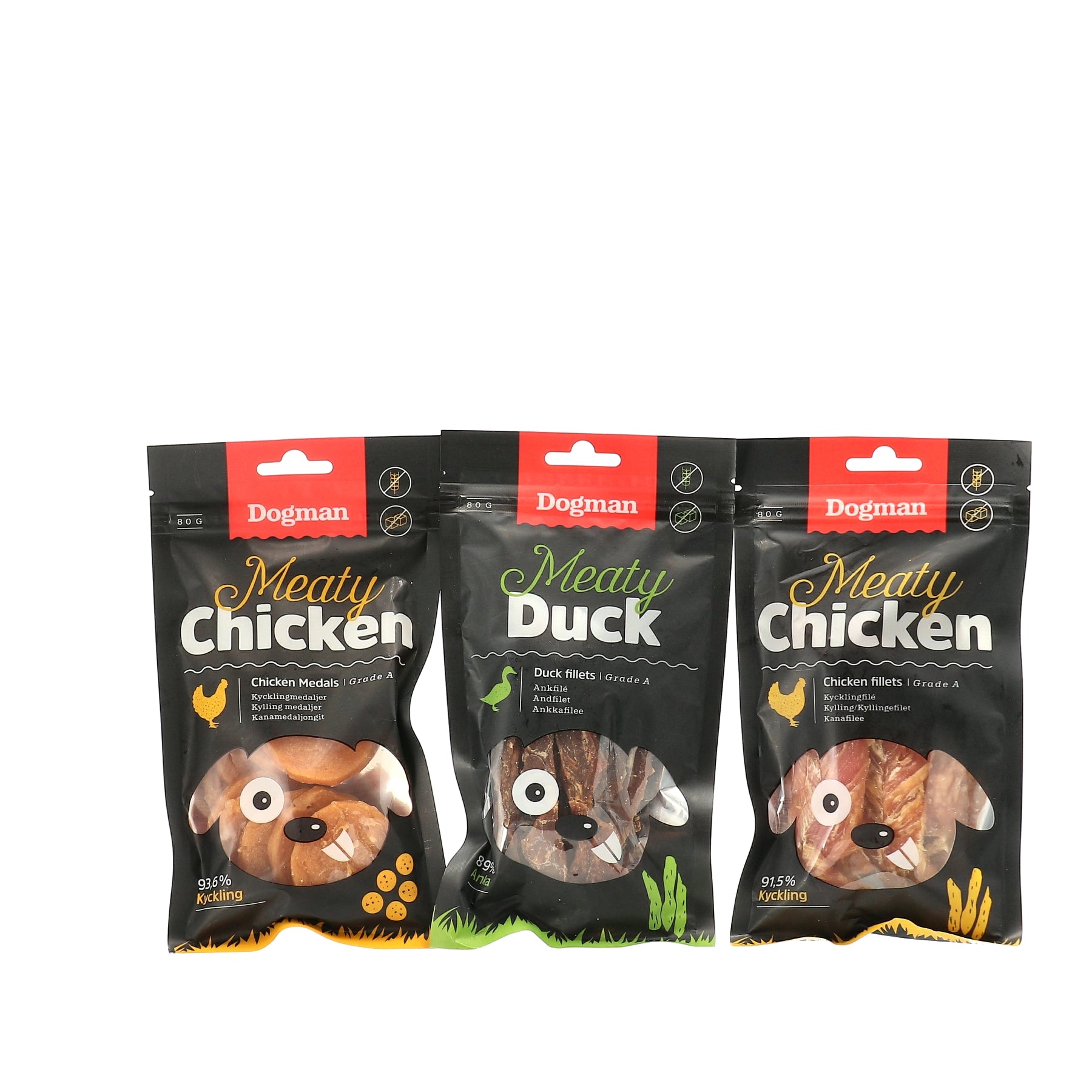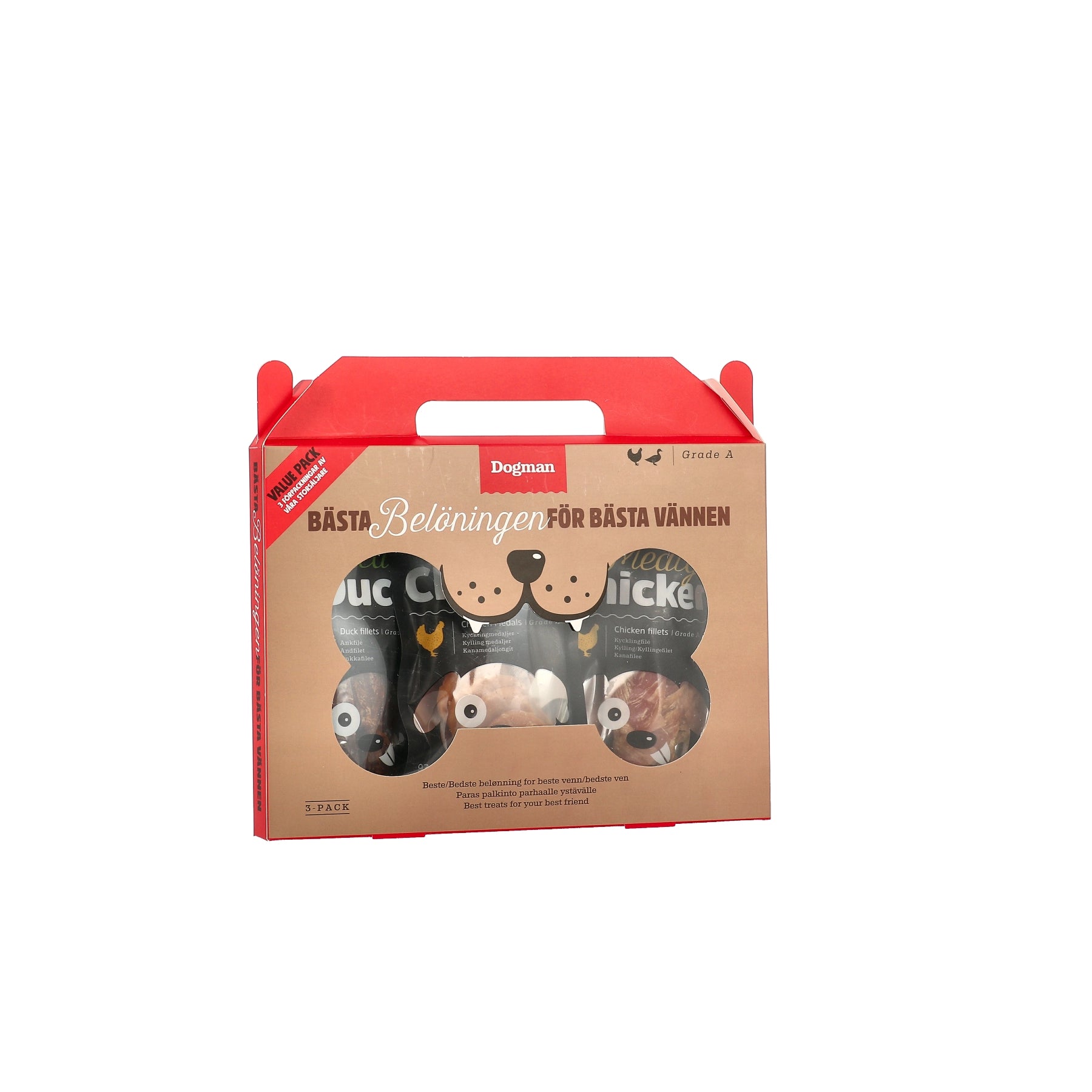 Dogmans bästa oemotståndliga hundgodis i en valuepack. Passar perfekt till kräsna hundar! Kan även brytas till mindre bitar. Ges som belöning vid sidan av en balanserad kost. Smak av anka och kyckling.