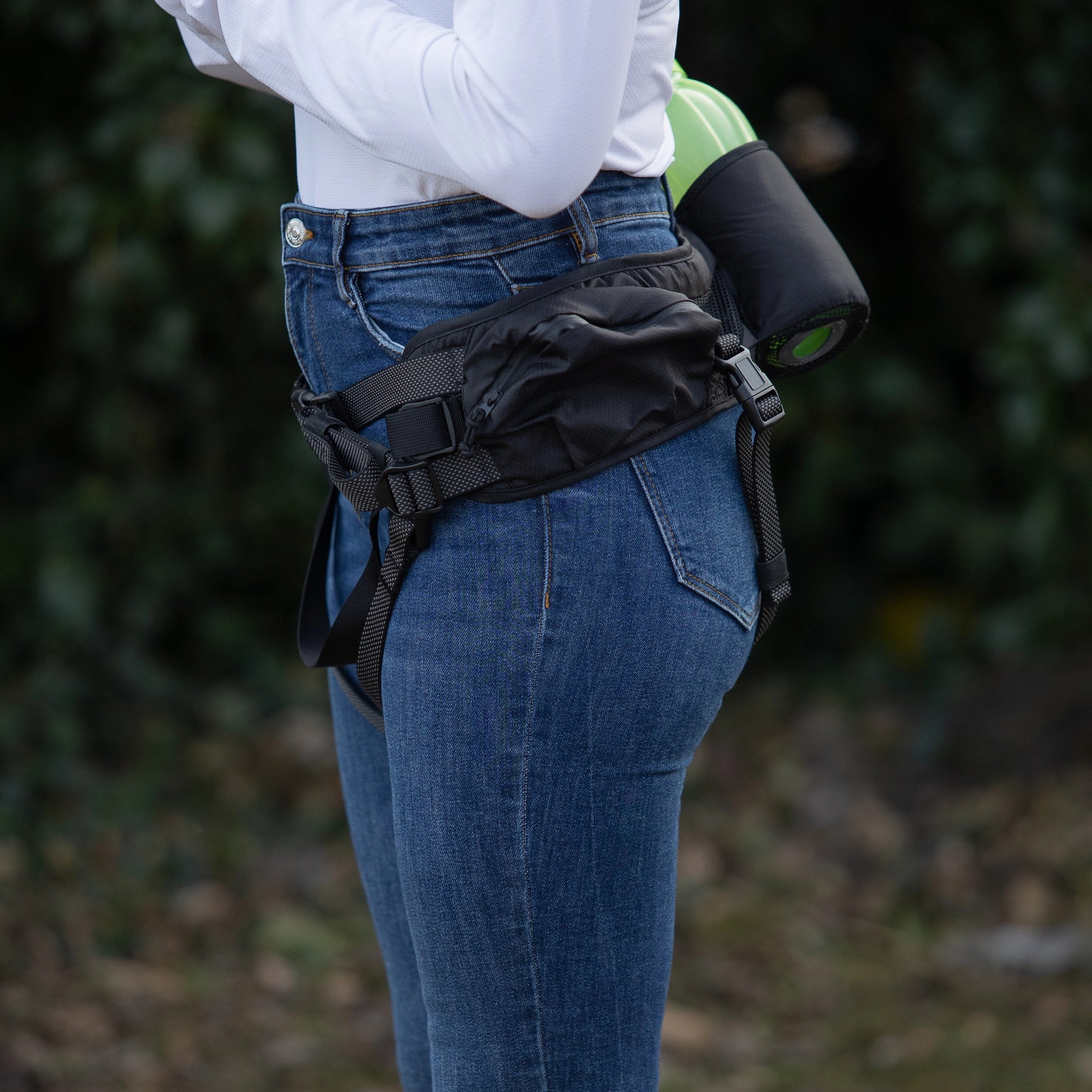 Midjebältet har en vattenflaskhållare samt två fickor - den ena med en smidig öppning för bajspåsar. Remmar mellan benen för att hindra bältet från att glida upp. Kopplet fäster du i ett band med snabblås för att enkelt kunna koppla loss vid behov.