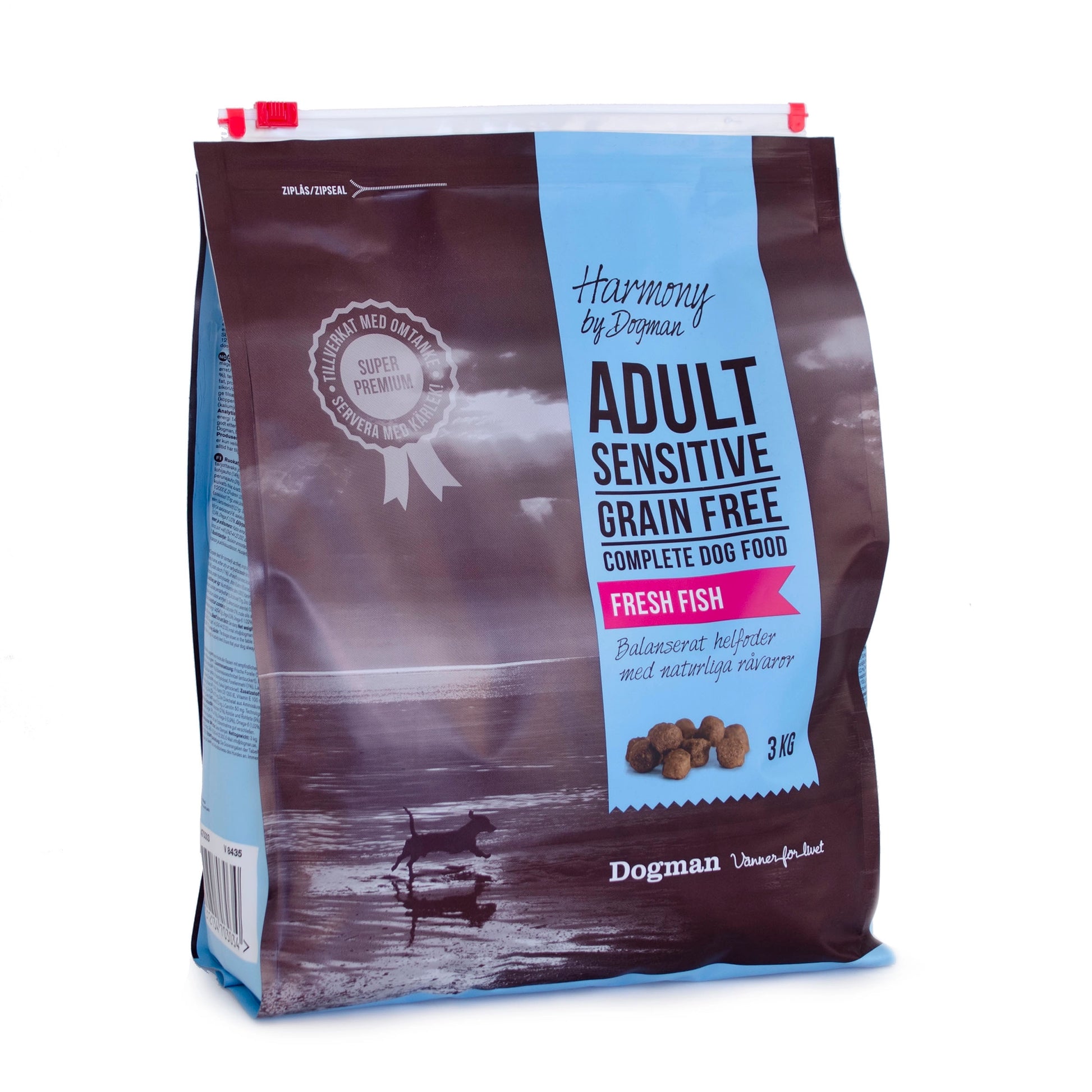 Harmony Adult Sensitive - Ett näringsmässigt balanserat premiumfoder med fisk för vuxna hundar av alla raser. Då fodret är milt och skonsamt passar det bra till hundar med känslig mage. Fodret innehåller naturliga råvaror, superfoods och färsk fisk, som höjer smakligheten och kan påverka matsmältningen positivt. Vi vill ge din hund en bra upplevelse av mat som gör gott i magen också. Harmony Adult Sensitive innehåller allt din hund behöver utan onödiga tillsatser som soja, färgämnen och smakförstärkare. Harmony ger din hund en bra magkänsla! Foderkulans storlek: ø 10x12mm.