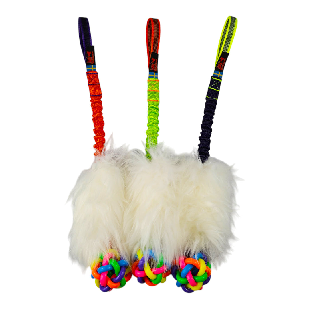 Färgglad belöningsleksak bestående av en öppen boll, lurvigt fårskinn med ett expanderband som avslutas med ett handtag i supergrip.