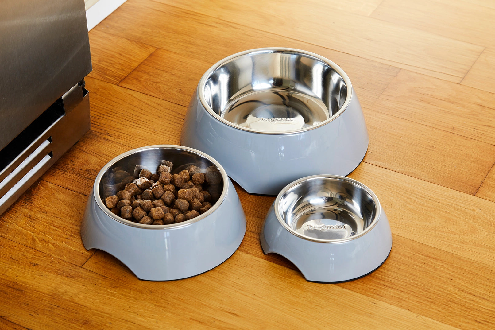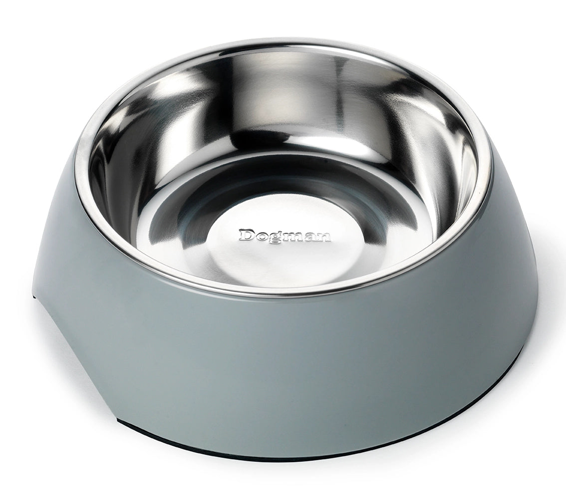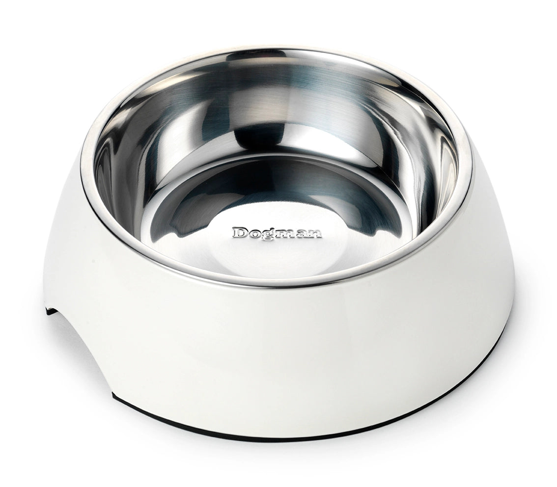 Stilren och klassisk mat- eller vattenskål i melamin med rostfri innerskål. Gummikanten på undersidan tillsammans med skålens tyngd gör att den står stadigt.
