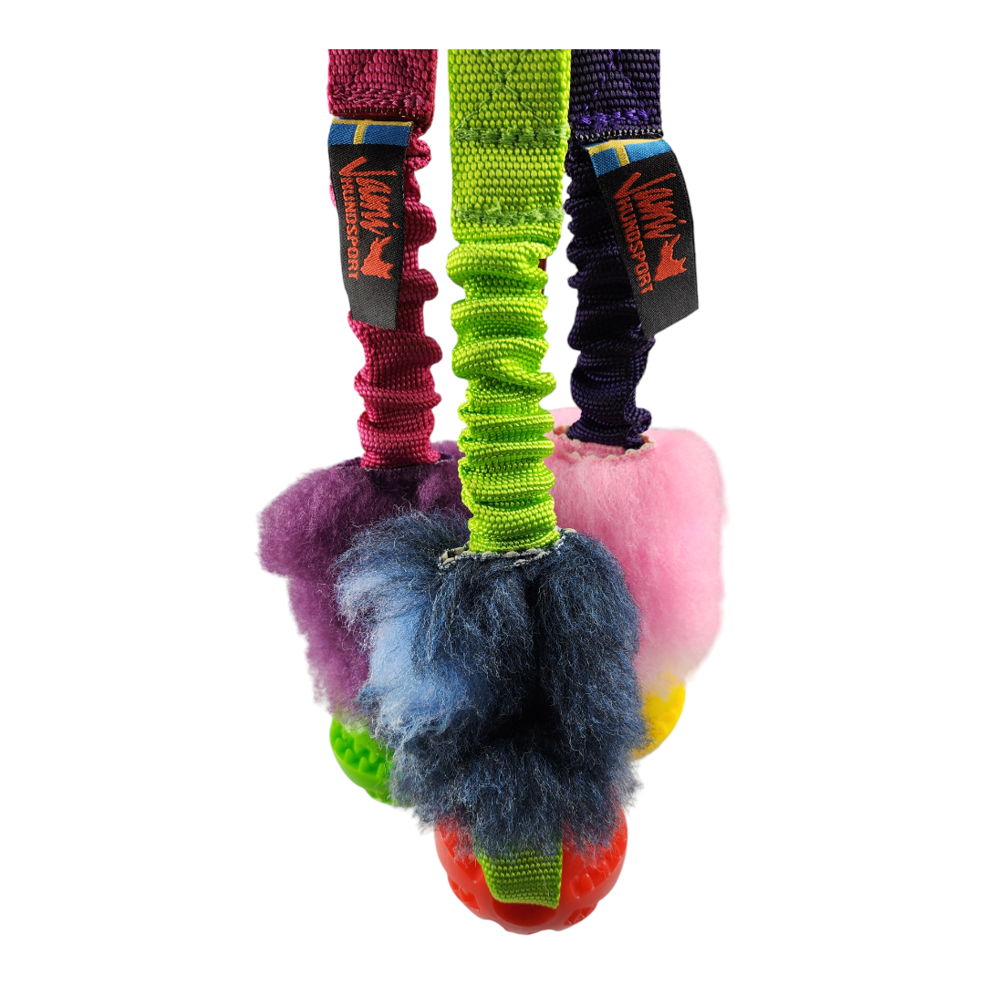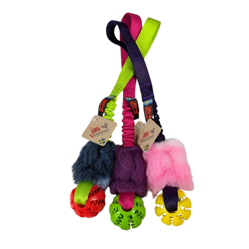 Hundarna älskar den mjuka taggiga bollen och det fluffiga luddet. Expanderband med handtag gör det skönt både för hundens nacke och din kropp. Belöningsleksak med expanderband, fuskpäls och taggig boll.