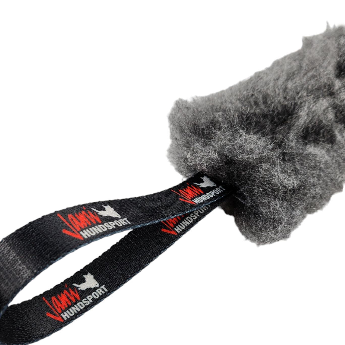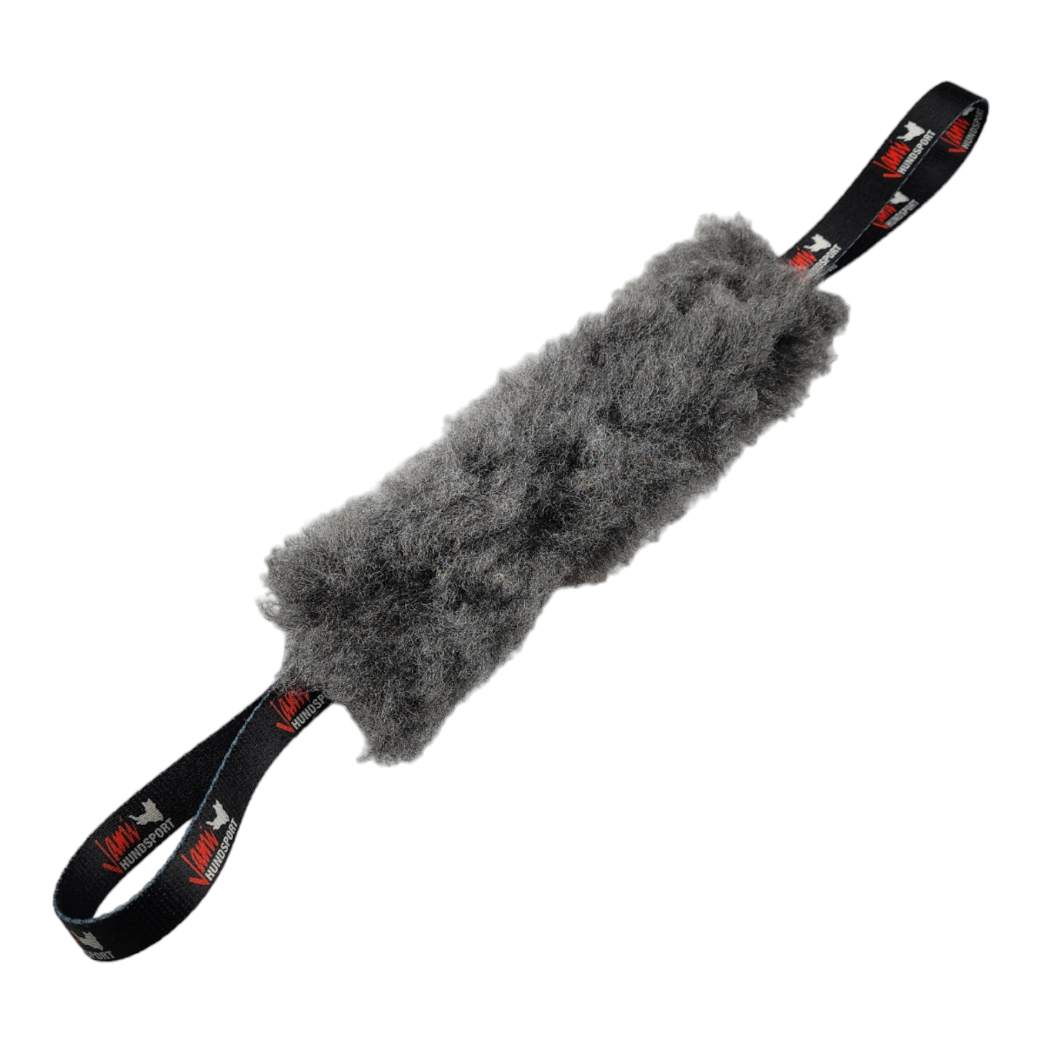 Handtag i båda ändar så du får ett bra grepp när du leker med din hund. Pälsdelen är 25 x 8 cm och fastsydd på bandet till handtagen för bästa hållbarhet. Tål tuffa tag.