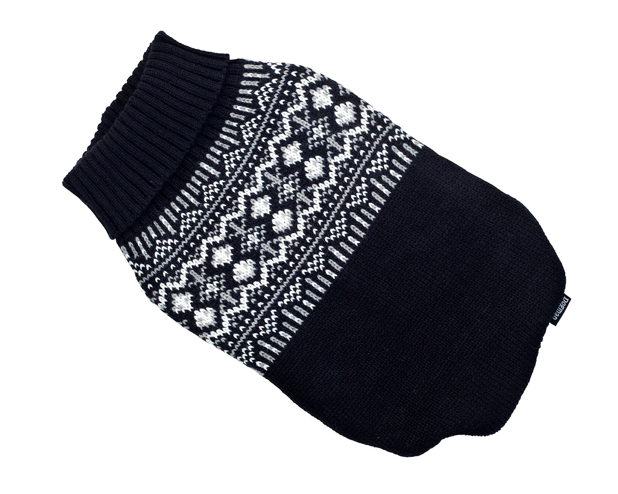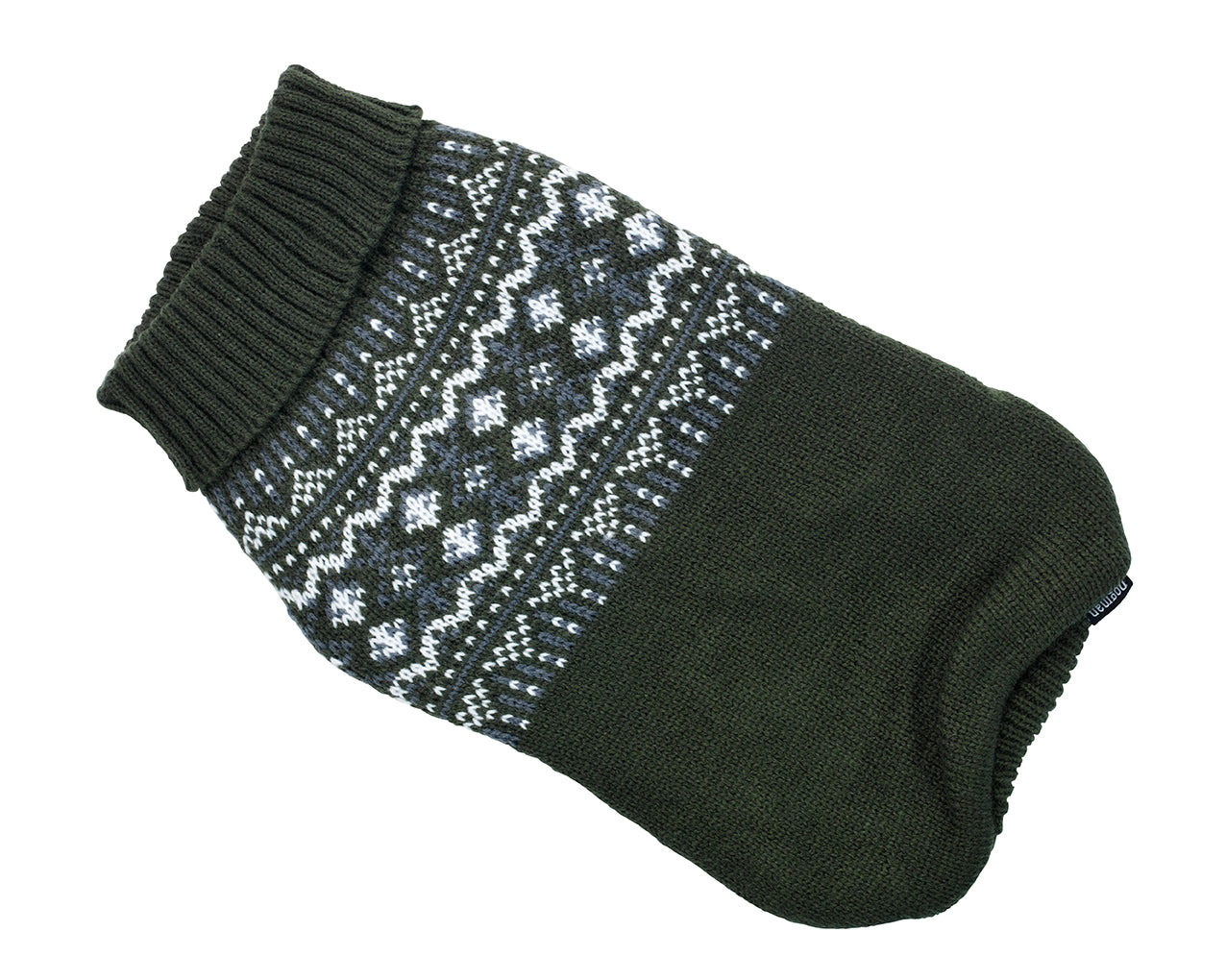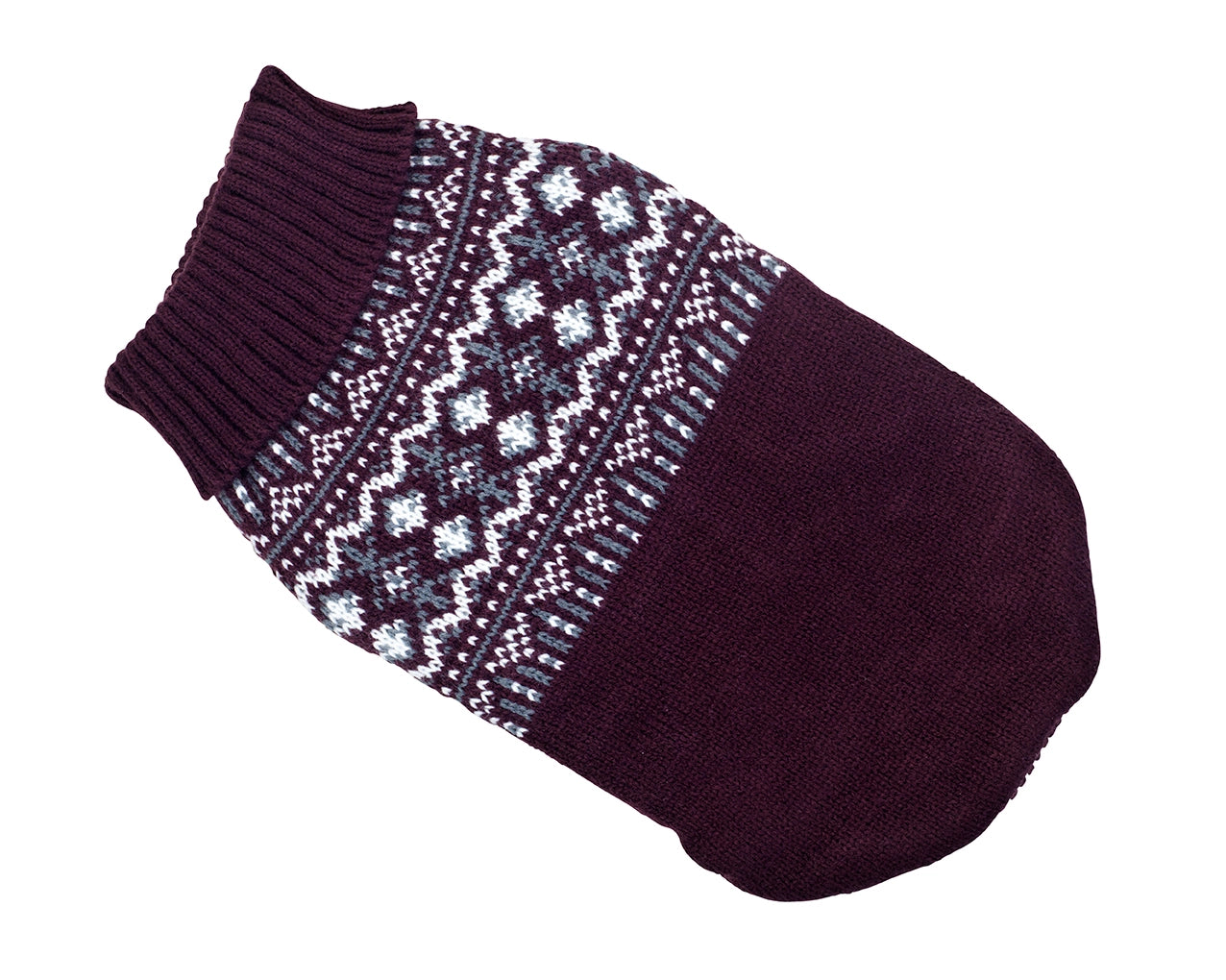 Skön tröja med fint mönster och härlig krage. För att hålla tröjan på plats har den korta muddar runt frambenen och band vid bakbenen .Tröjan är av 100% Akryl.