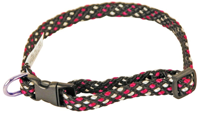Valphalsband med prickar i färgerna rött, blått och svart. Halsbandet har klicklås och är justerbart. Ett bra första halsband till valpen.